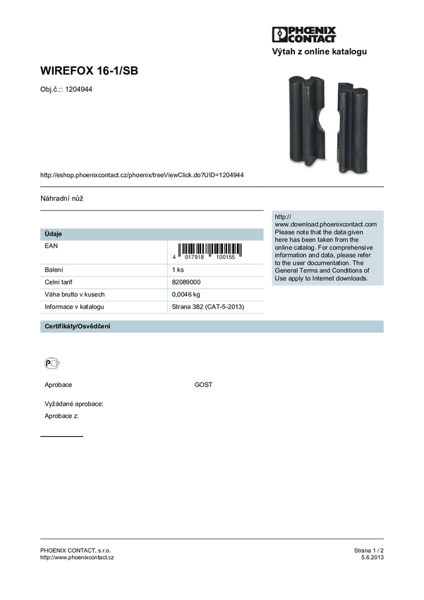 Nóż zapasowy WIREFOX 16-1/SB Phoenix Contact 1204944