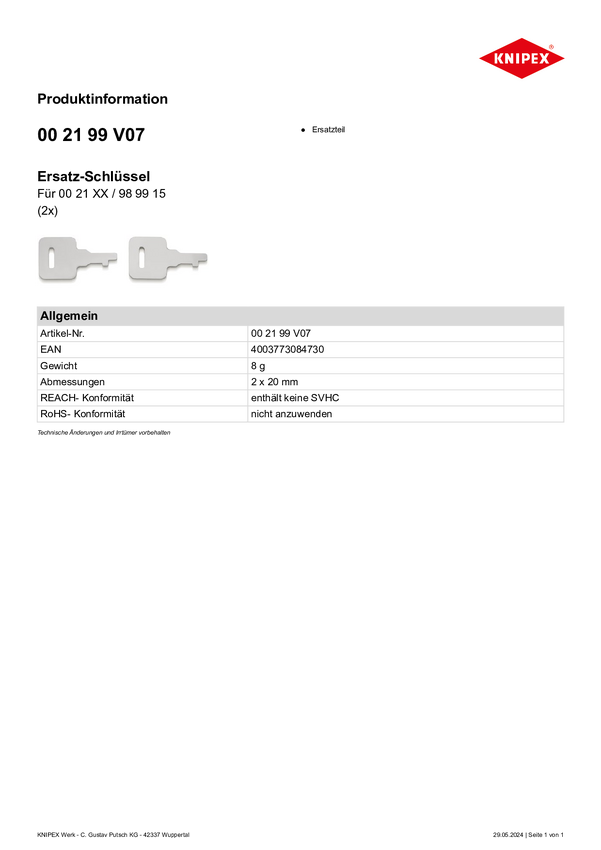 Klucz zapasowy Knipex Knipex-Werk 00 21 99 V07, 1 szt.
