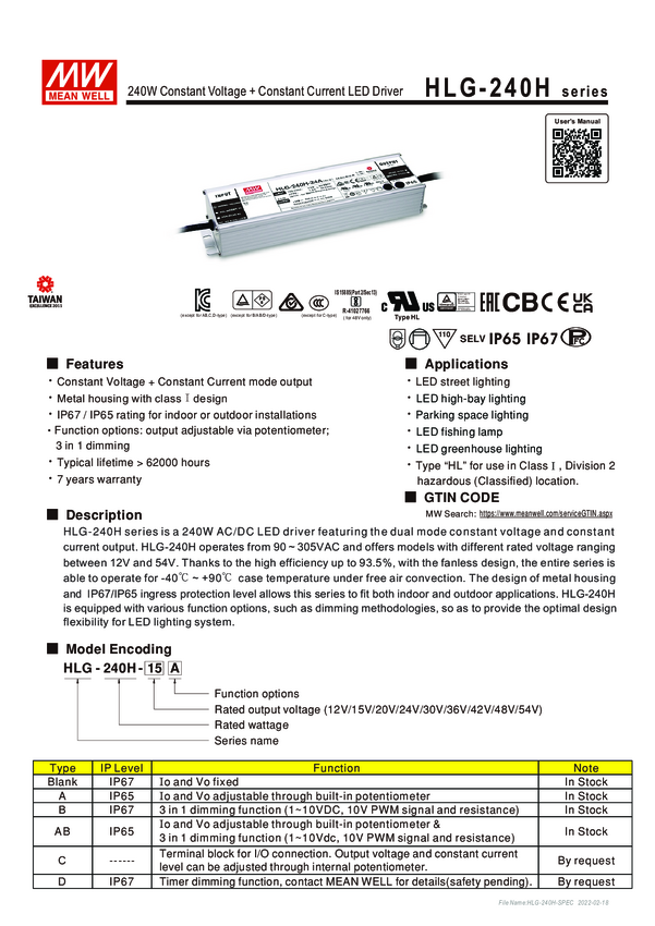 Zasilacz impulsowy LED do zastosowań wewnątrz i na zewnątrz MEAN WELL HLG-240H-36, N/A