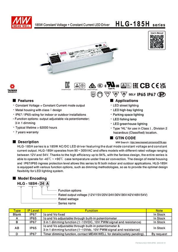 Zasilacz impulsowy LED do zastosowań wewnątrz i na zewnątrz MEAN WELL HLG-185H-12, N/A