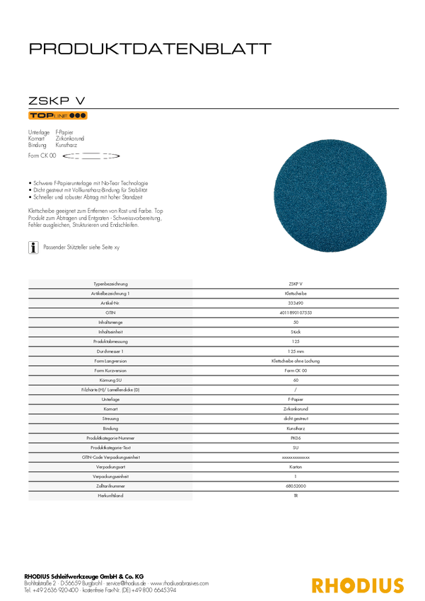 Rhodius 333490 RHODIUS ZSKP V, 50 krążków rzepowych 125 mm, kształt CK 00, ziarno 60, TOPline do uniwersalnego zastosowa