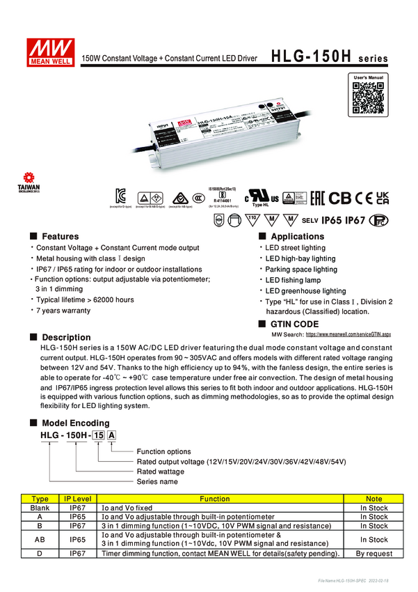 Zasilacz impulsowy LED do zastosowań wewnątrz i na zewnątrz MEAN WELL HLG-150H-24, N/A