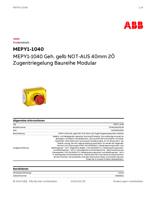 ABB 1SFA611821R1040 MEPY1-1040 Przycisk zatrzymania awaryjnego 1 szt.