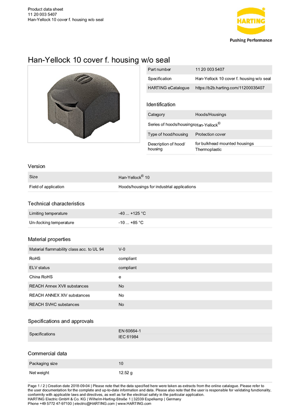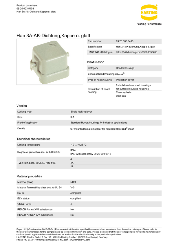 Zatyczka Harting 09 20 003 5408, 1 szt.