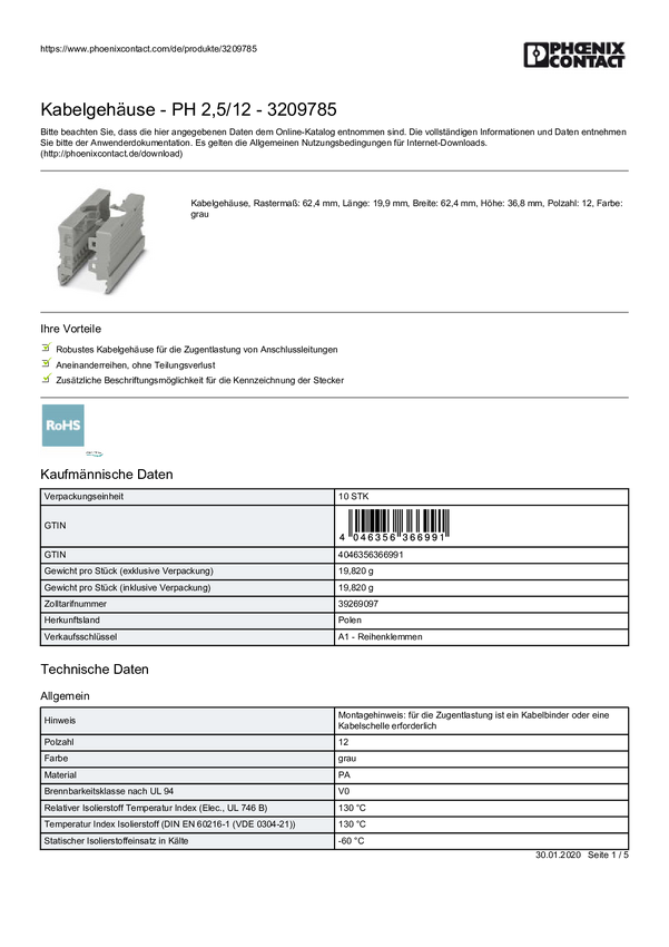 Obudowa kablowa PH 2,5/12 3209785 Phoenix Contact Zawartość: 10 szt.