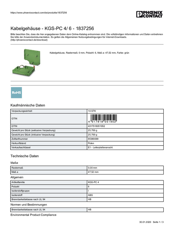 Obudowa kablowa KGS-PC 4/ 6 1837256 Phoenix Contact Zawartość: 10 szt.