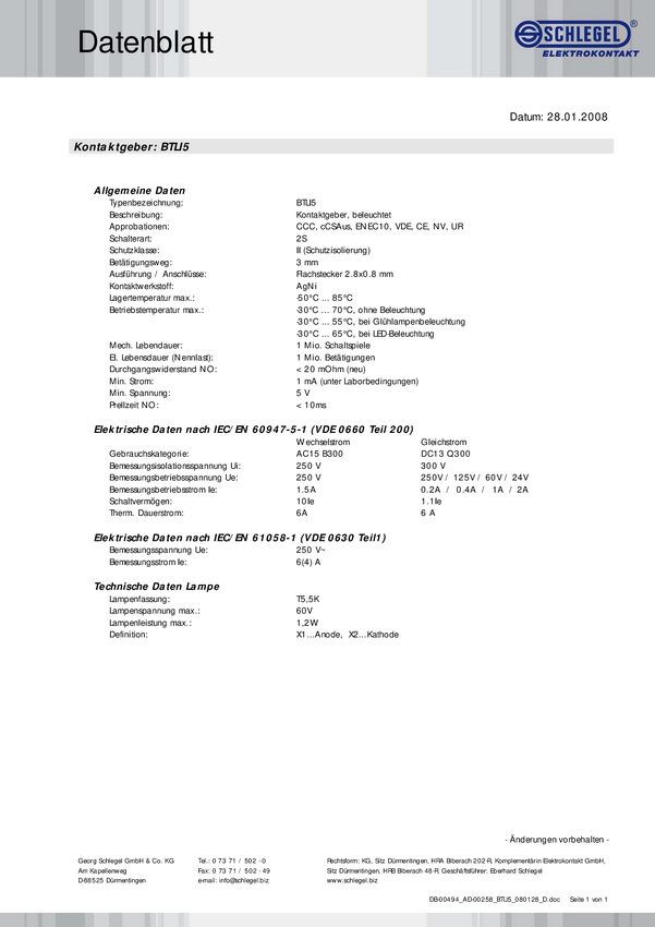 Element stykowy BTLO5 zawiera gniazdo lampy 2 NC chwilowy 250 V Schlegel BTLO5 1 szt.