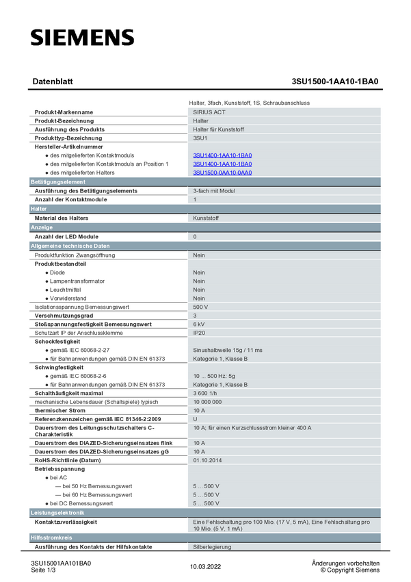 Siemens 3SU1500-1AA10-1BA0 Uchwyt zawiera adapter 1 NO 500 V 1 szt.
