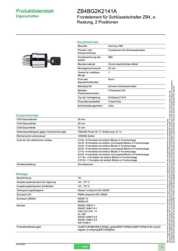Schneider Electric ZB4BG2K2141A Przełącznik kluczykowy (stacyjkowy), przedni element 1 szt.