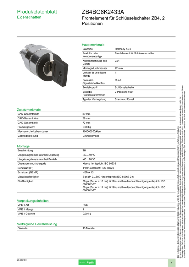 Schneider Electric ZB4BG6K2433A Element przedni z przyciskiem 1 szt.