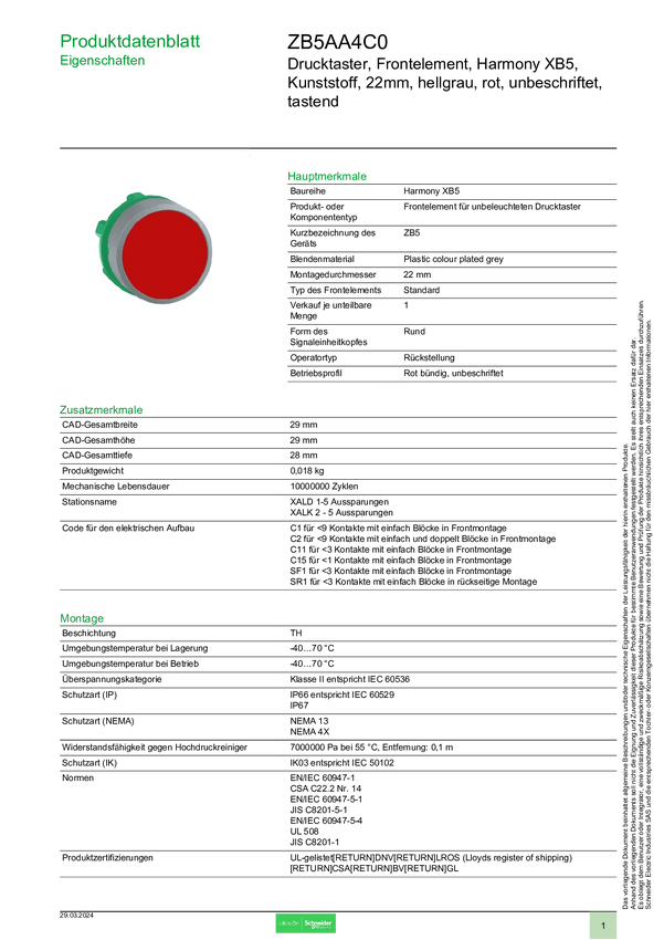 Schneider Electric ZB5AA432C0 Element przedni z przyciskiem 1 szt.
