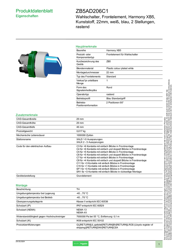 Schneider Electric ZB5AD206 Przełącznik wyboru, przedni element 1 szt.