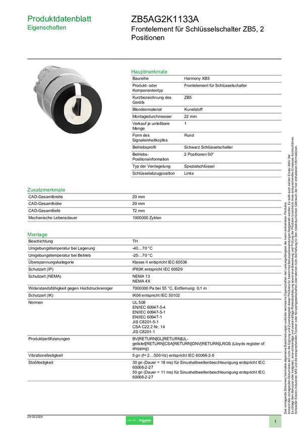 Schneider Electric ZB5AG2K1133A Przełącznik kluczykowy (stacyjkowy), przedni element 1 szt.