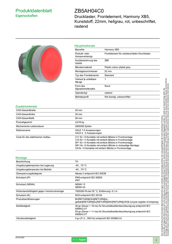 Schneider Electric ZB5AH04C0 Element przedni z przyciskiem 1 szt.