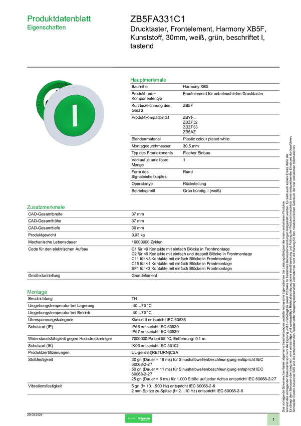 Schneider Electric ZB5FA335C0 Element przedni z przyciskiem 1 szt.