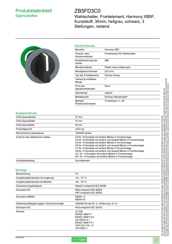 Schneider Electric ZB5FD3C0 Przełącznik wyboru, przedni element 1 szt.