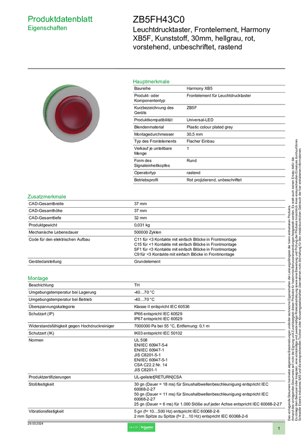 Schneider Electric ZB5FH43C0 Element przedni z przyciskiem 1 szt.
