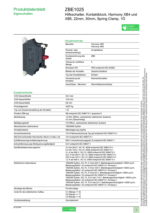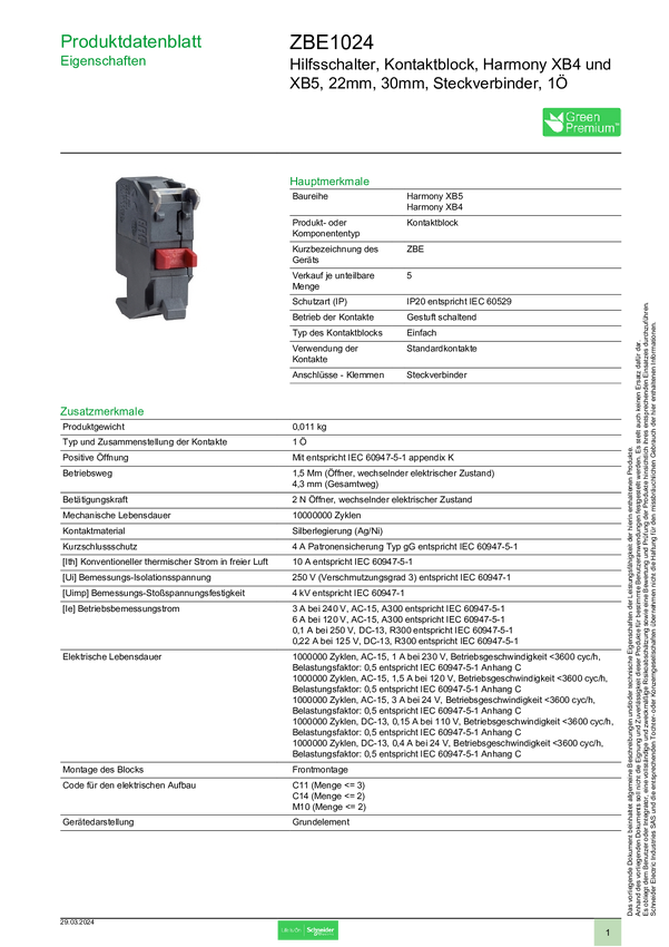 Blok przełącznika pomocnicznego Schneider Electric ZBE1024, 5 szt.