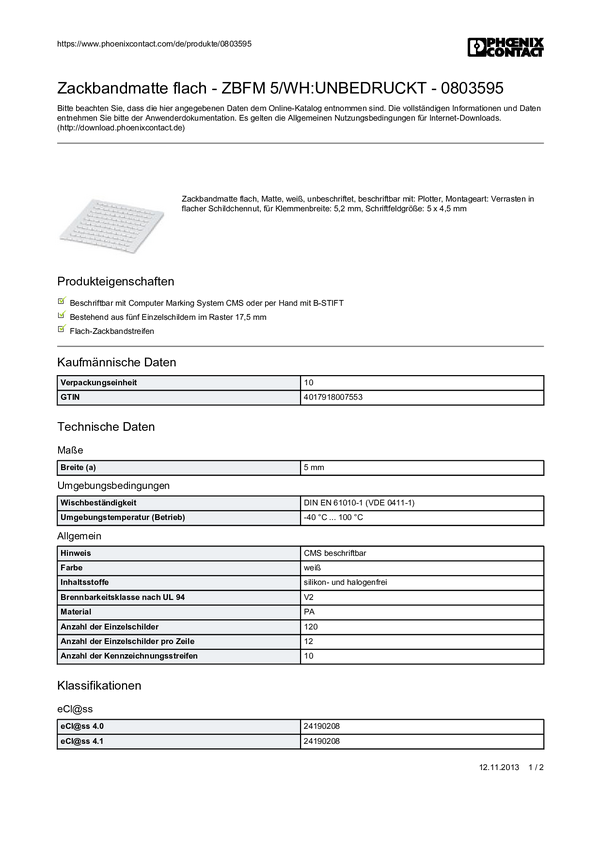 Pasek do etykietowania Phoenix Contact ZBFM 5/WH:UNBEDRUCKT 0803595, 10 szt.