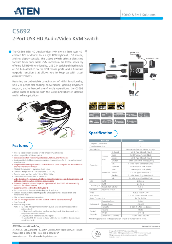 2-portowy przełącznik USB kabla HDMI/Audio KVM ze zdalnym selektorem portu- AT