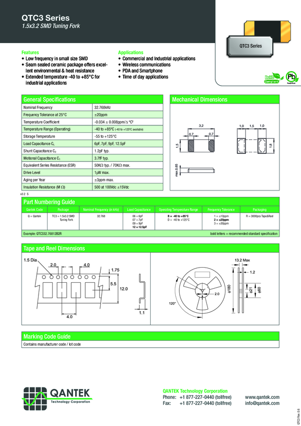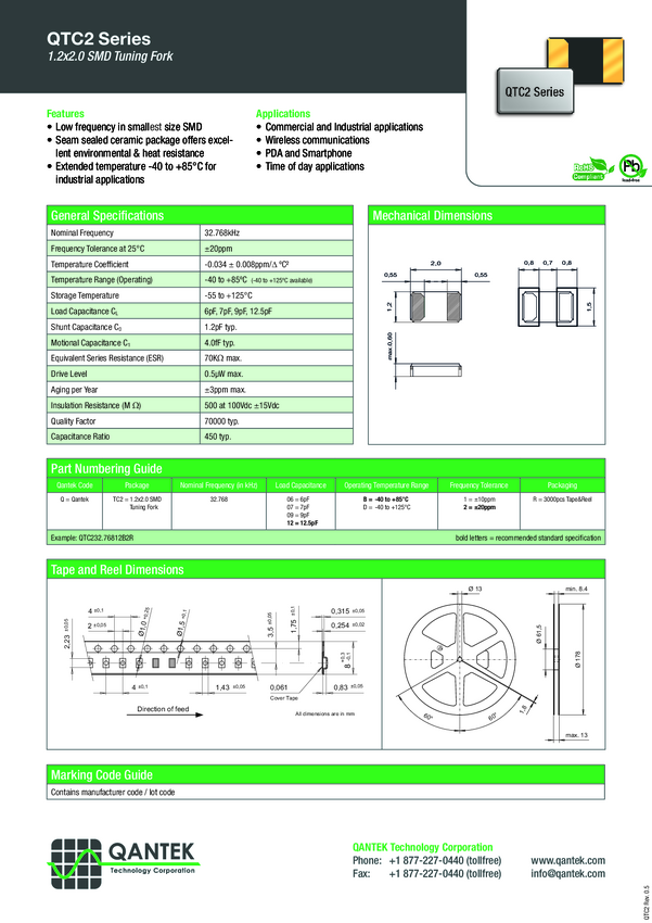 Qantek Kwarc zegarkowy QTC232.76807B2R SMD-2 32.768 kHz 7 pF 1.2 mm 2 mm 0.6 mm 1 szt. taśma cięta