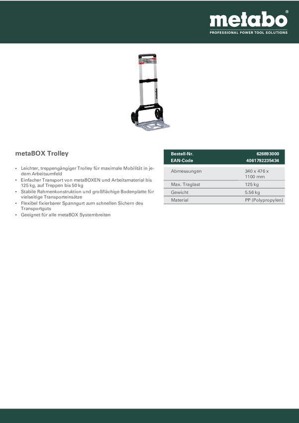 Wózek transportowy Metabo 626893000 (D x S x W) 340 x 476 x 1100 mm
