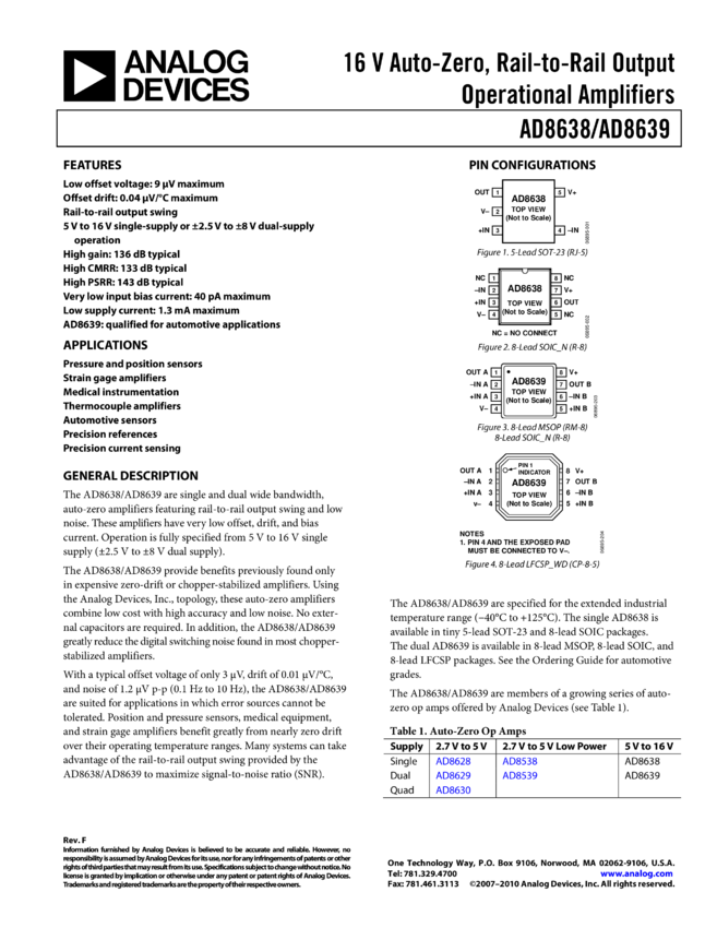 AD8638: 16 V Auto-Zero, Rail-to-Rail Output Operational Amplifier