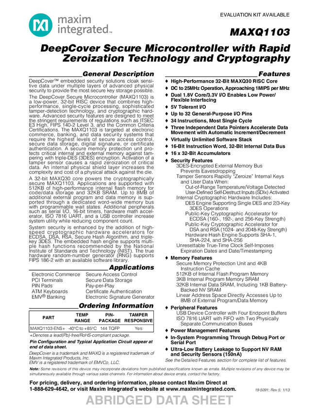 MAXQ1103 DeepCover Secure Microcontroller with Rapid Zeroization Technology and Cryptography