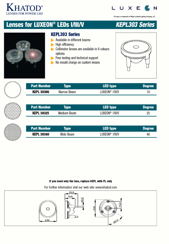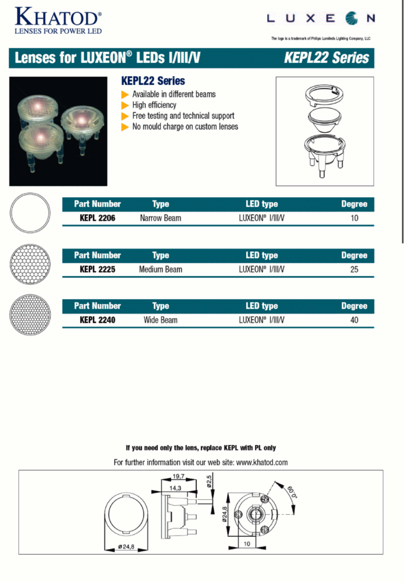 Zestaw 3x soczewek KEPL2225 z podstawką, soczewki kąt 25°, D= 24.8mm