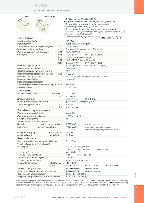 Przekaźnik, 8A, zestykiem zwiernym (1Z), napięcie cewki 5V DC, IP64