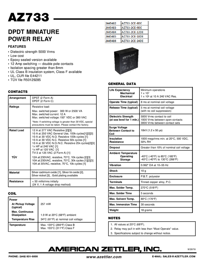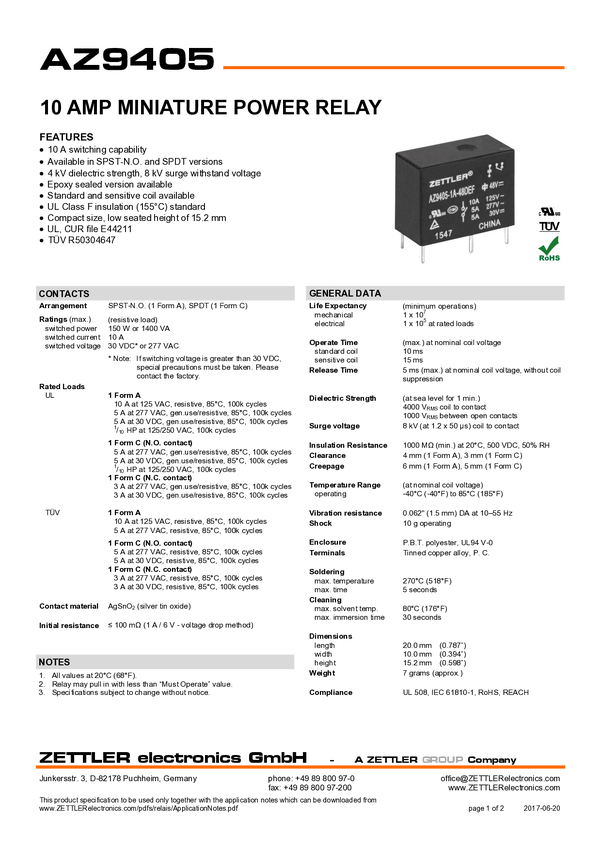 Zettler Electronics AZ733-2CE-12DE Przekaźnik SMT AZ733-2CE-12DE, monostabilny, 1 cewka, 150 V/DC, 380 V/AC, 12 A, 1 szt