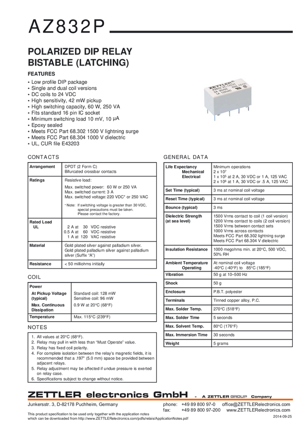 Przekaźnik subminiaturowy Zettler Electronics AZ822-2C-24DE, 24 V/DC/120 V/AC