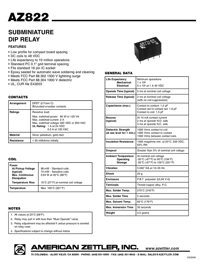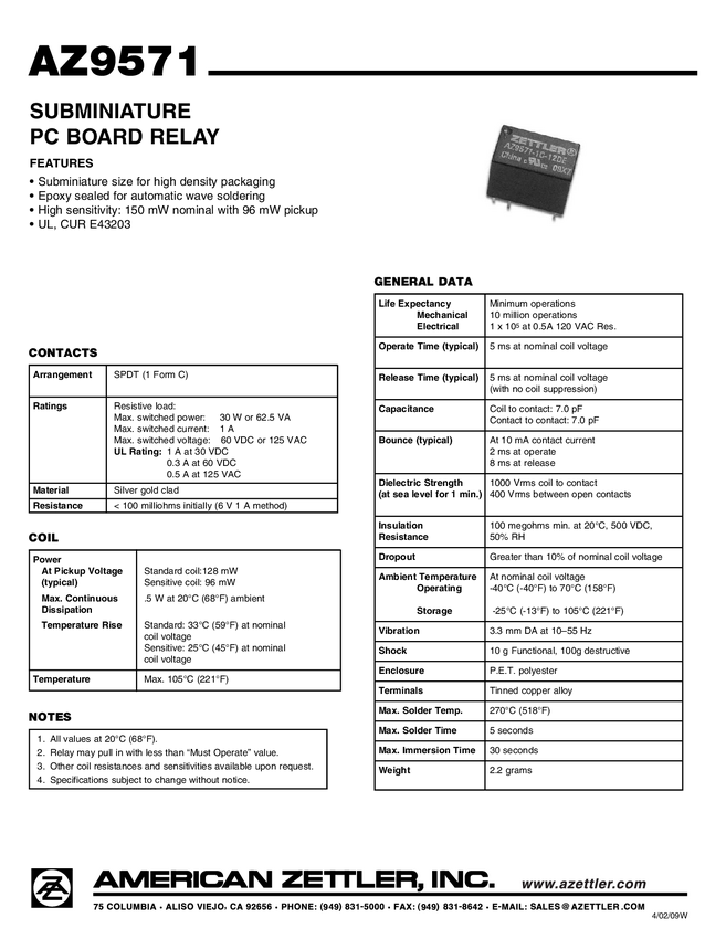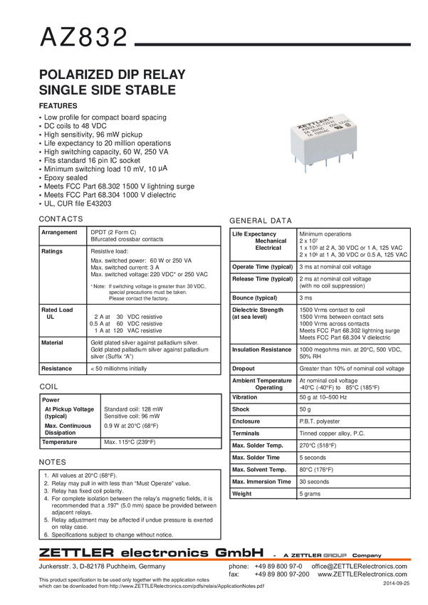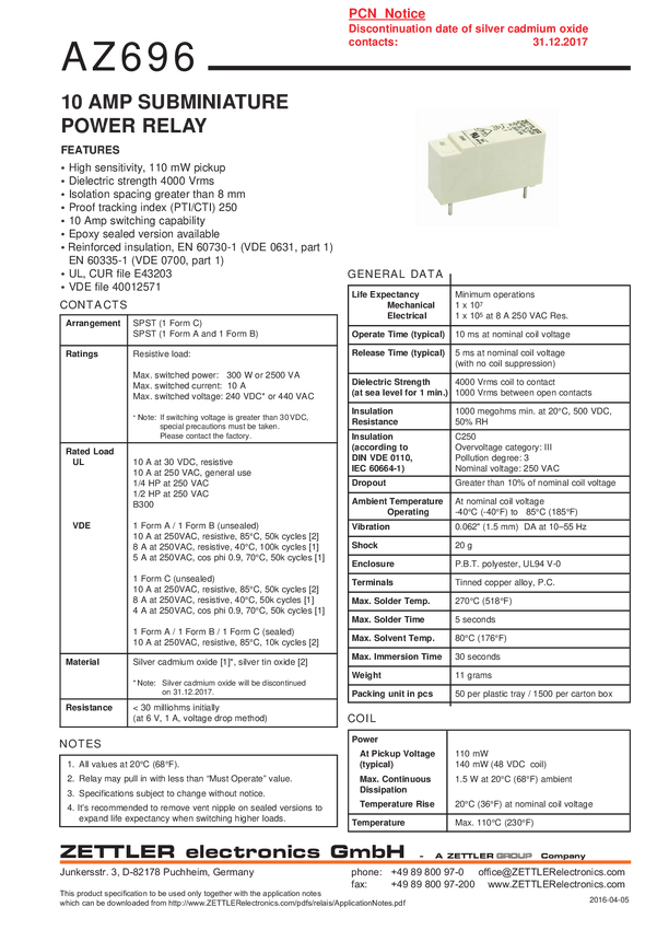 Przekaźnik subminiaturowy Zettler Electronics AZ9571-1C-12DSE, 60 V/DC/125 V/AC