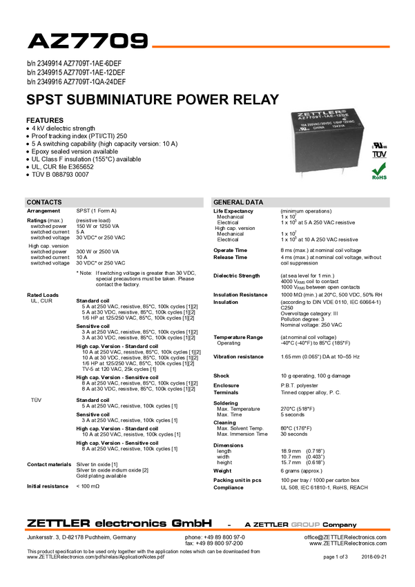 Przekaźnik; elektromagnetyczny; AZ9371-1A-12D; 12V DC; 5A; 30V DC; 5A/250V AC; SPST-NO 1 styk zwierny; ZETTLER; = ALDP112, SRB-S-112DM, G5NB-1A4-12DC, HF46F-012-HS1T, F3AA012E, 202H-1AH-F-C-12VDC; RoHS