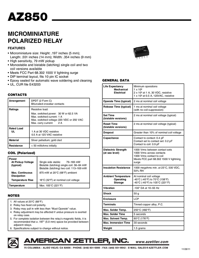 Zettler Electronics AZ850P2-12 Przekaźnik SMT 12 V/DC 1 A 2 zestyki przełączne 1 szt.
