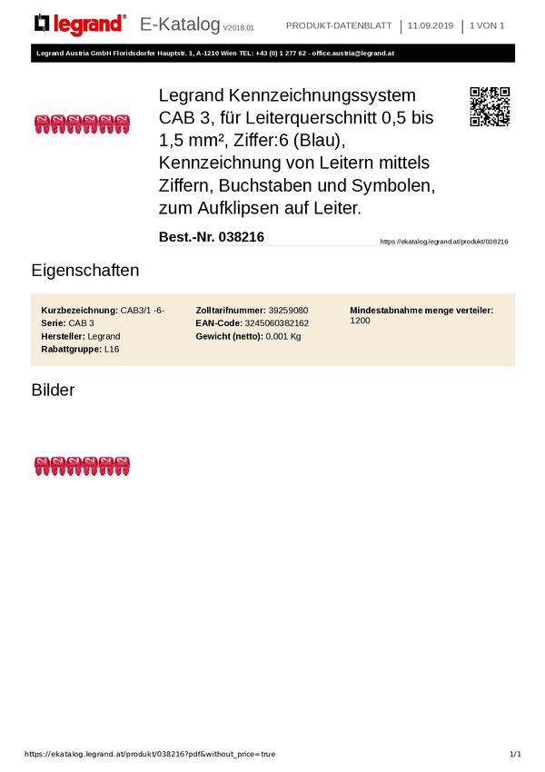 Legrand Legrand 038216 Oznacznik kablowy Nadruk 6 Zakres średnicy zewnętrznej 2 do 3.20 mm 038216