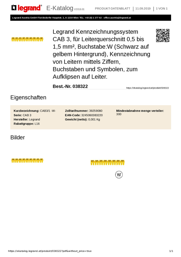 Legrand Legrand 038322 Oznacznik kablowy Nadruk W Zakres średnicy zewnętrznej 2 do 3.20 mm 038322