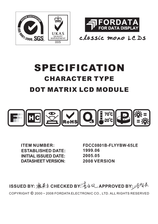 Matryca 8x1znaków, pozytywowa, z podświetleniem LED zółto-zielonym, zółto-zielona STN, z filtrem UV, 6:00, -20/+70C, ekran , Font English-Japanese, FORDATA [FDCC0801B-FLYYBW-65LE]