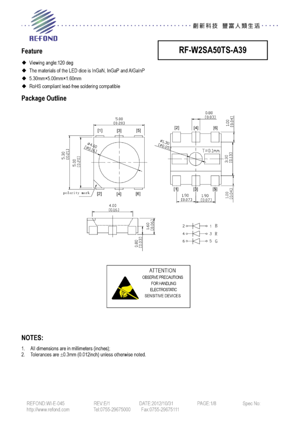 Dioda LED, czerwona: 620-630nm, 400-700mCd; zielona: 515-525nm, 700-1100mCd; niebieska: 565-475nm, 500-700mCd, 20mA/chip, water-clear, 140°, PLCC6, Refond