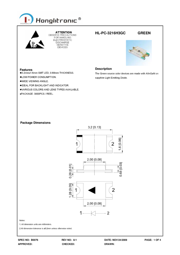 Dioda LED, SMD 1206, zielona (Yellow Green) 568-575 nm, ok.20 mCd /20mA, water clear, 120 stopni, Honglitronic