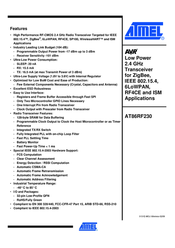 Single-chip 8-bit Microcontroller with Low Power 2.4GHz Transceiver for IEEE 802.15.4 and ZigBee Applications