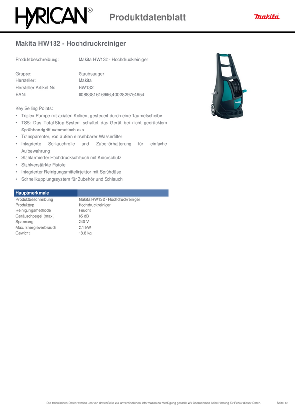 Makita Myjka ciśnieniowa 140 bar Zimna woda