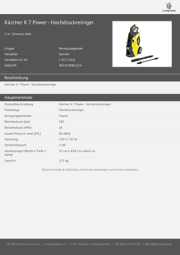 Kärcher Home & Garden K 7 Power *EU Myjka ciśnieniowa 180 bar Zimna woda