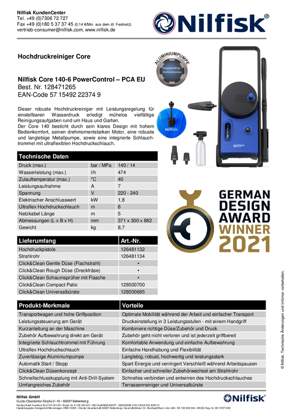Nilfisk Core 140-6 PowerControl - PCA EU Myjka ciśnieniowa 140 bar Zimna woda