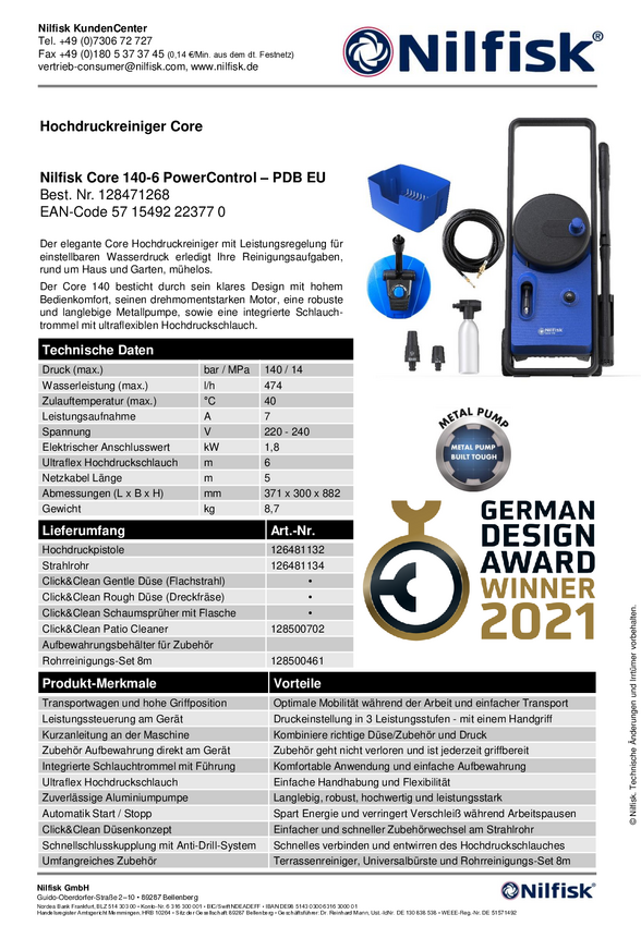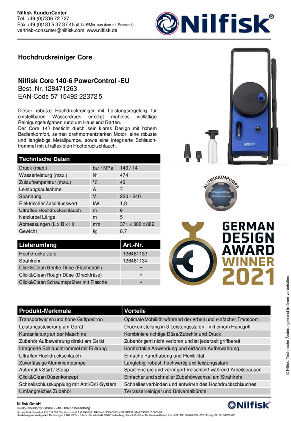 Nilfisk Core 140-6 PowerControl - PDB EU Myjka ciśnieniowa 140 bar Zimna woda