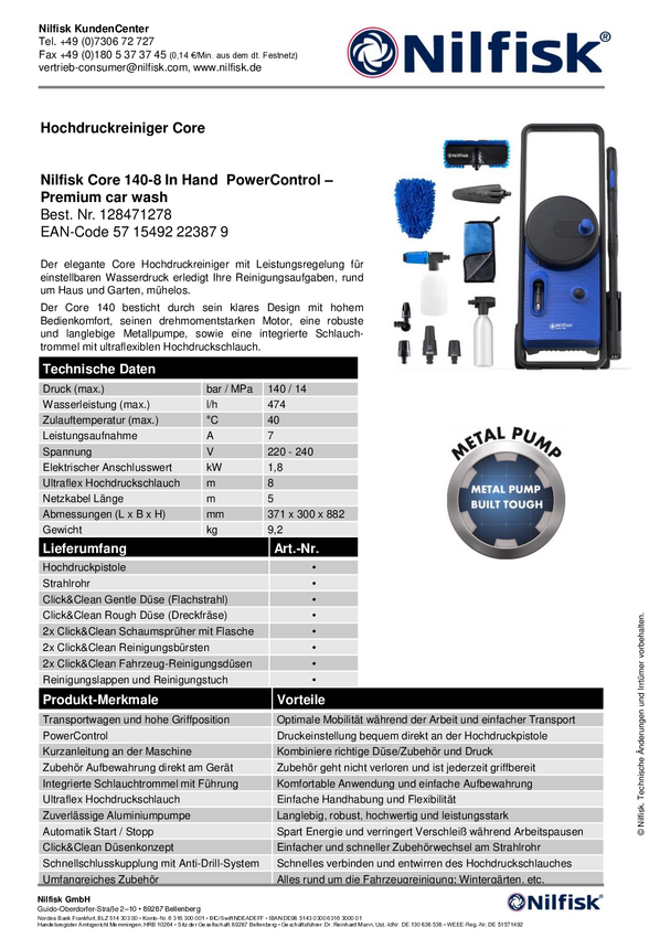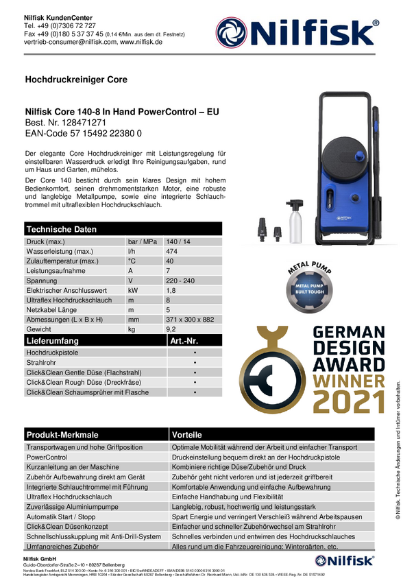Nilfisk Core 140-8 In Hand Powercontrol - Premium car wash EU Myjka ciśnieniowa 140 bar Zimna woda