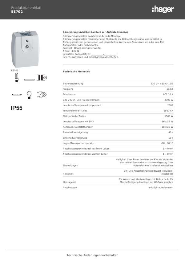 Przełącznik zmierzchowy Hager EE702, 230 V