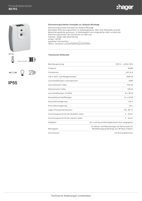 Przełącznik zmierzchowy Hager EE701, 230 V