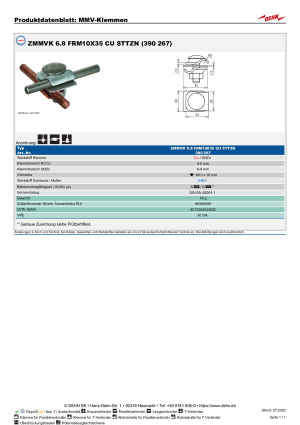 DEHN 390267 ZMMVK 6.8 FRM10X35 CU STTZN Dwumetrowy zacisk MV 1 szt.