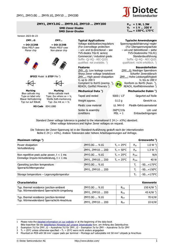 Diotec Dioda Zenera ZMY4.3G Typ obudowy półprzewodnika DO-213AB Napięcie Zenera 4.30 V Moc (maks) P(TOT) 1 W Odwrócone n